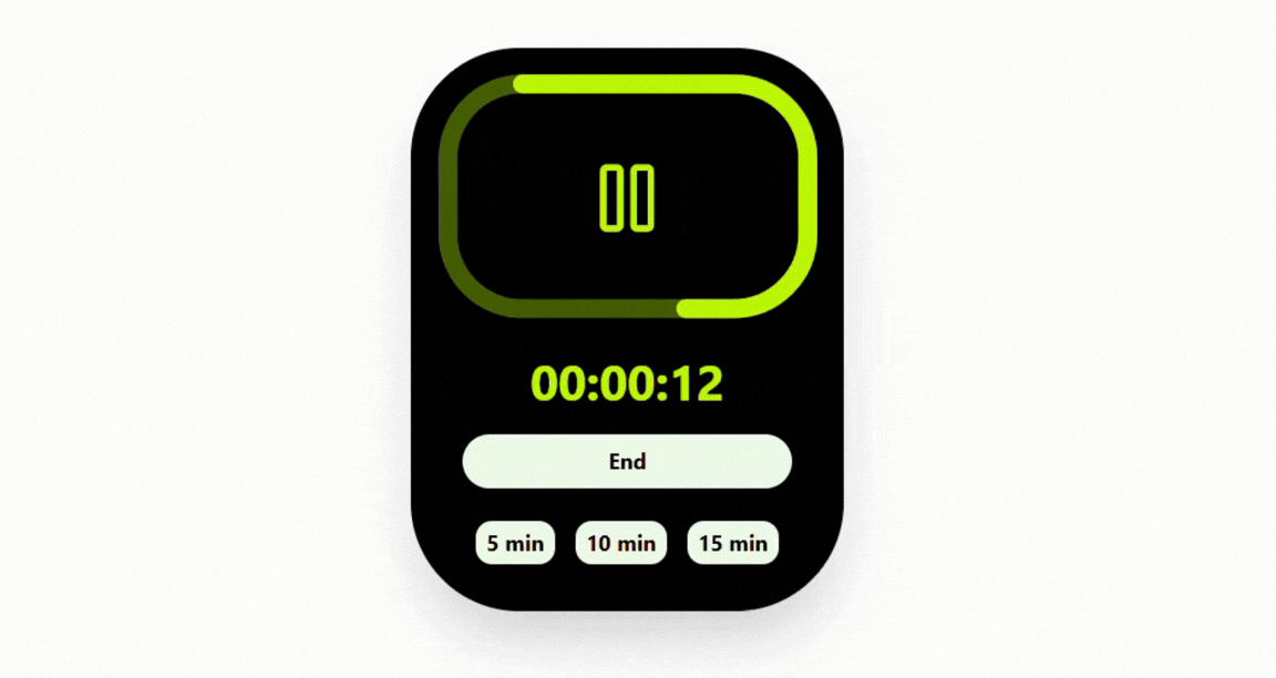 A React-based countdown timer with an animated square progress border and dynamic color transitions, displaying time in HH:MM:SS format.
